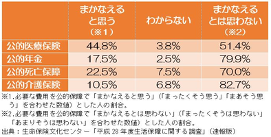 急速な少子高齢化の進展もあり、本来、生活の安心を支えてくれるはずの社会保障制度の先行きを不安に思う人が増えていることも、これらの数字の背景にはあるようです。生命保険文化センターの「平成28年度生活保障に関する調査」(速報版)では、自分の老後の日常生活費を公的年金で「まかなえると思う」と回答した人は17.5%と非常に低く、「まかなえるとは思わない」が79.9%となっています。同じく自分が将来要介護状態になった場合の介護費用について、8割以上の人が公的介護保険だけではまかなえないと考えています。