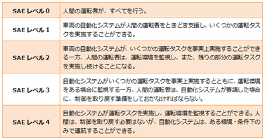 SAEレベル0は人間の運転者が、すべてを行うもの。レベル1は車両の自動化システムが人間の運転者をときどき支援し、いくつかの運転タスクを実施することができるもの。レベル2は車両の自動化システムが、いくつかの運転タスクを事実上実施することができる一方、人間の運転者は、運転環境を監視し、また、残りの部分の運転タスクを実施し続けることになるというもの。レベル3は自動化システムがいくつかの運転タスクを事実上実施するとともに、運転環境をある場合に監視する一方、人間の運転者は、自動化システムが要請した場合に、制御を取り戻す準備をしておかなければならないというもの。レベル4は自動化システムが運転タスクを実施し、運転環境を監視することができる。人間は、制御を取り戻す必要はないが、自動化システムは、ある環境・条件下のみで運航することができるというもの。そして最終段階のレベル5は自動化システムが人間の運転者が運転できるすべての条件下において、すべての運転タスクを実施することができるというものです。